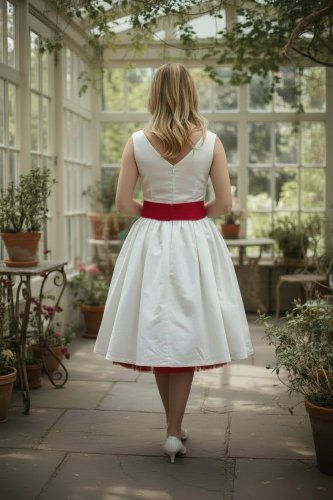 A tea length gathered skirt cutie. Scoop front & V back neckline bodice with a slight drop waist. Modified cap sleeves. A coloured sash ties in to a bow. Zip back closure. Comes with a matching coloured tulle petticoat.
