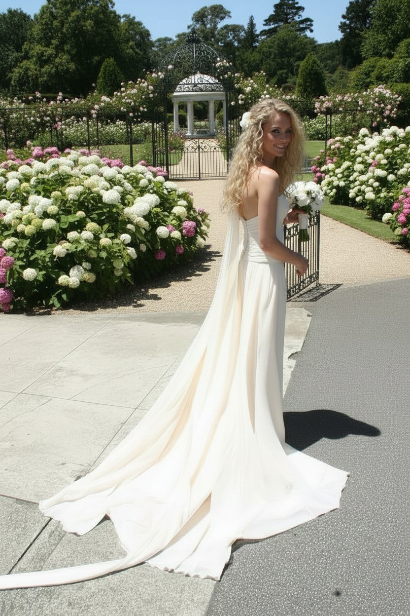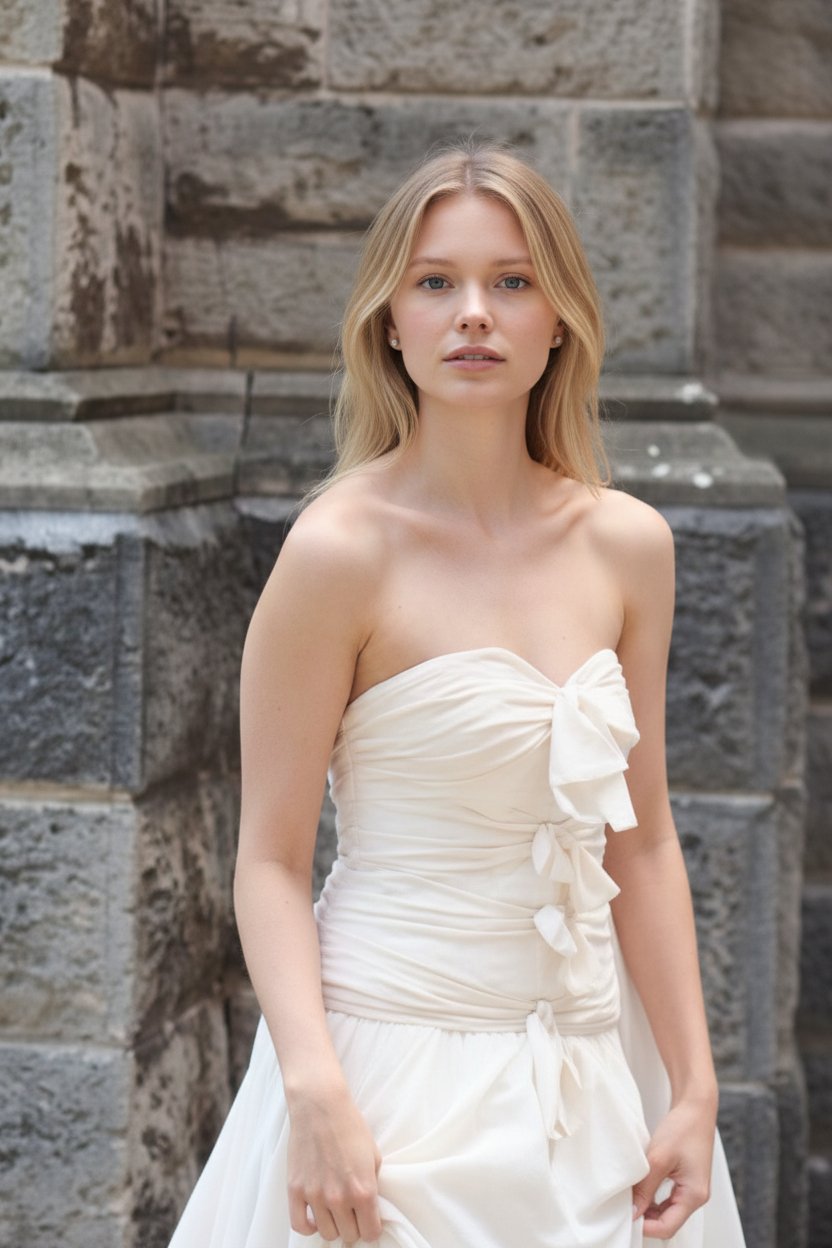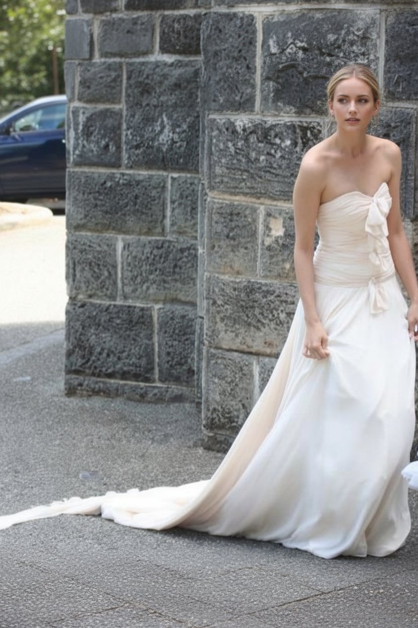 This super cute dress has a full gathered skirt flowing in to a train. The strapless bodice features bow knots on the front bodice. Zip & button back closure.