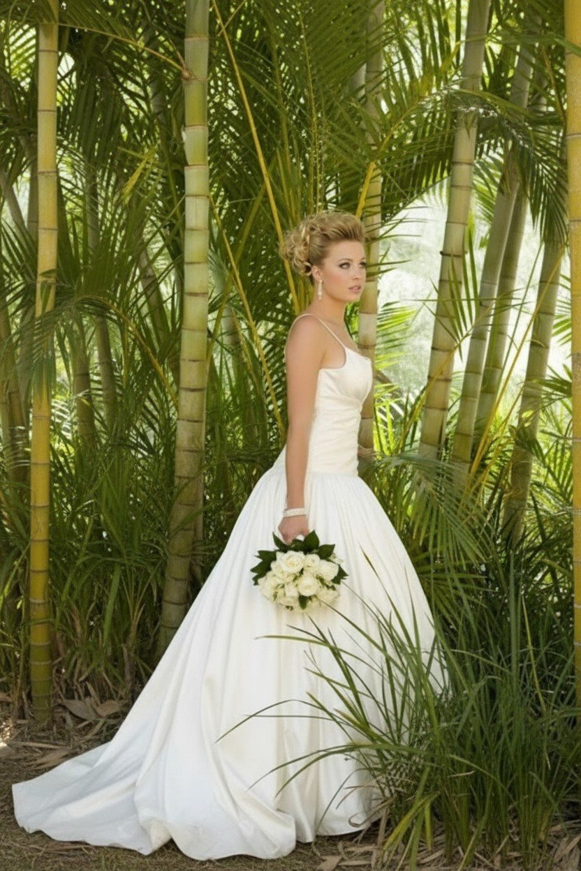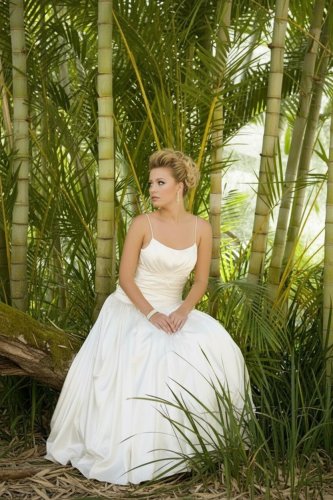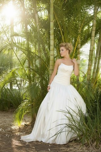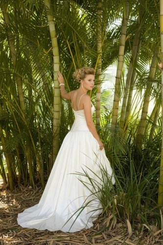 A fitted ruched drop waist bodice with a scoop neckline and thin straps. A full gathered skirt extending in to a chapel train. Zip & decorative button back closure. Can also be made with a natural waistline length bodice.