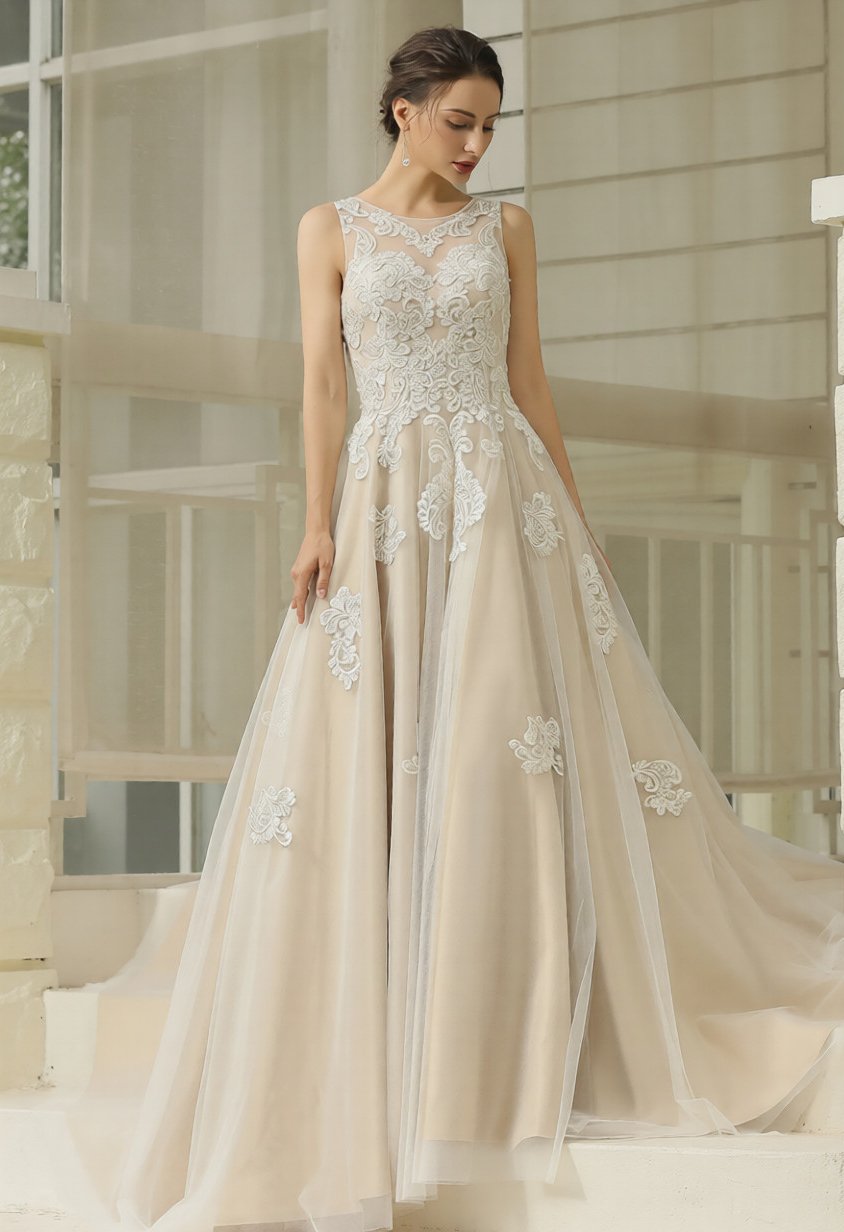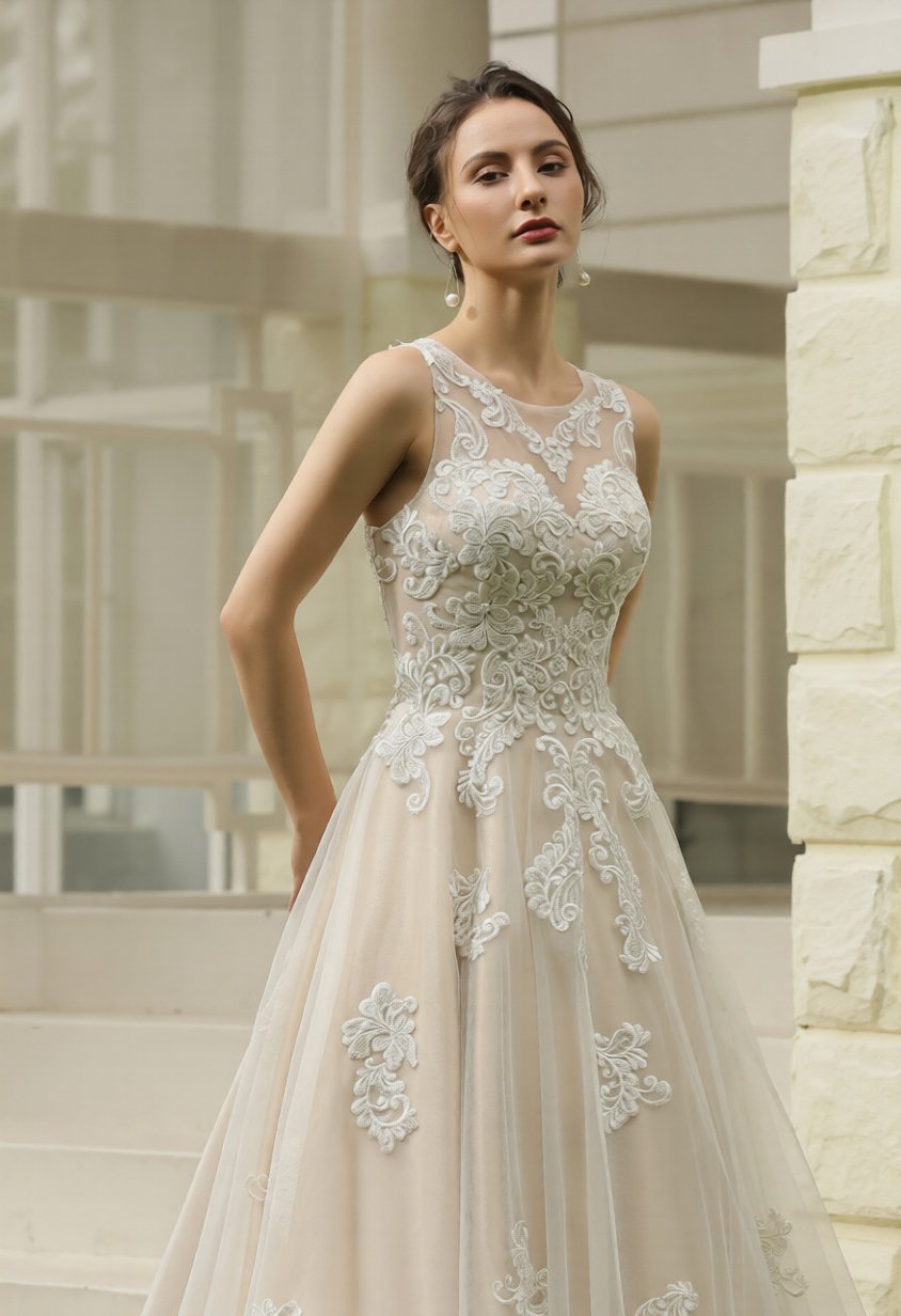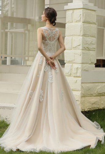 Stunning lace motif appilqued bodice with an illusion yoke front & back neckline. A classic A-line skirt extending into a train. Button & zip back closure.