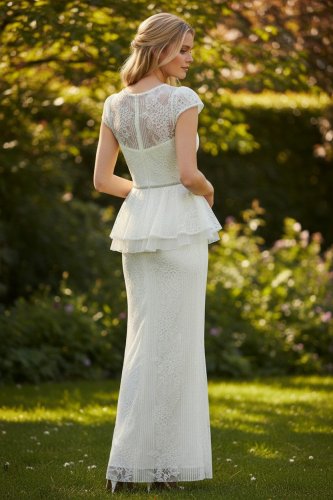 A 1940's inspired design. A fitted lace bodice with slightly puffed cap sleeves to give a broader shoulder look. a slim fit skirt with an organza & lace ruffle peplum feature. A rhinestone trim belt around the waist to finish the look. Floor length. Zip back closure.