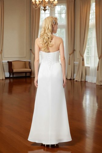 A modified A-line skirt with a crossover pleated open front. Sweetheart pleated front bodice. Detachable straps. Stock dress has a small train. Zip back closure.