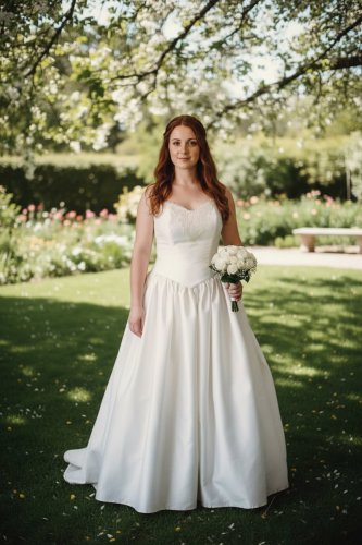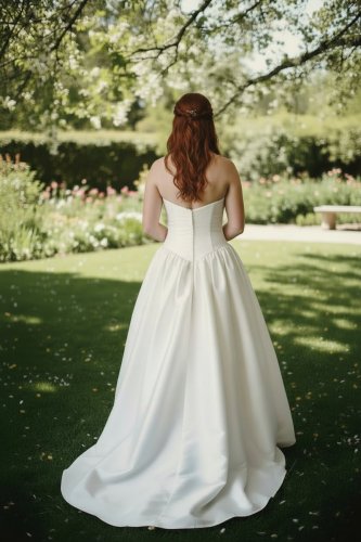 Strapless sweetheart neckline with a drop waist extending in to front & back peaks. A feature lace motif adorns the front (lace used is dependant upon availbility) A gathered skirt extends in to a back train. Button & zip back closure.