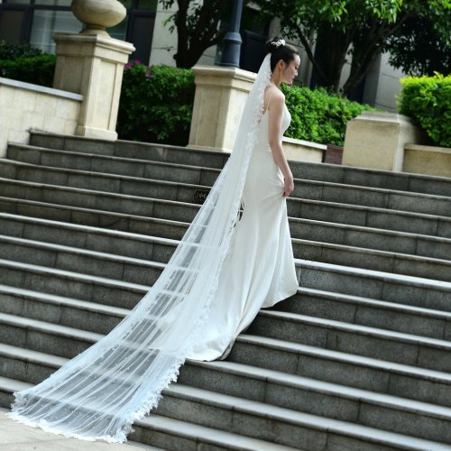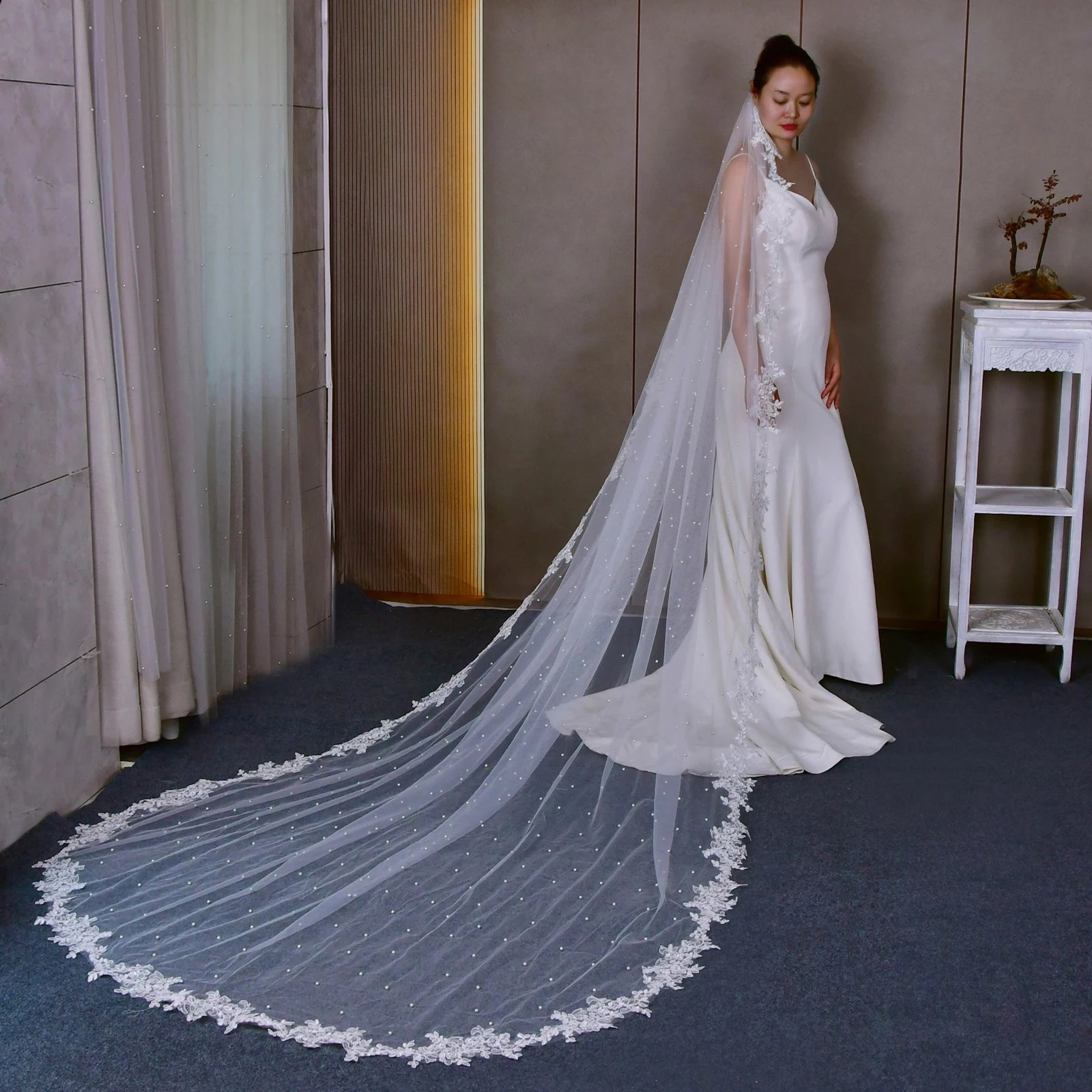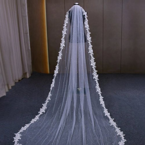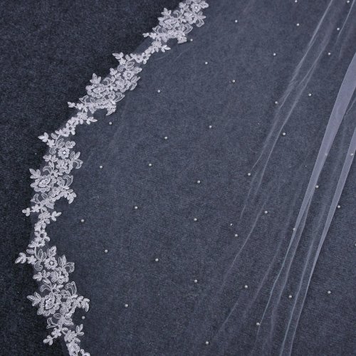 Corded lace edge. Scattered pearls throughout. Gathered on to a comb.