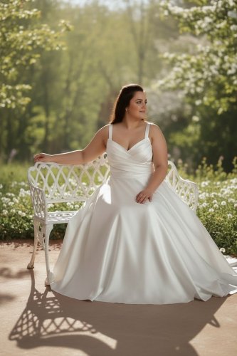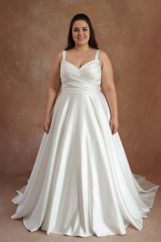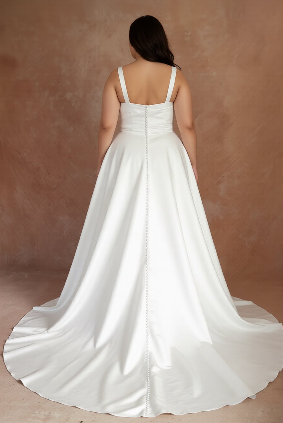 A simple & elegant A-line silhouette. Featuring a V neck, criss-cross bodice with wide straps. Chapel train. Decorative button & zip back closure.