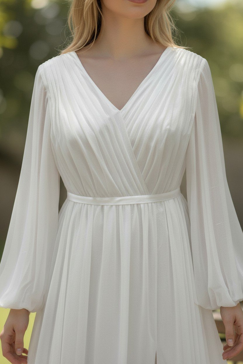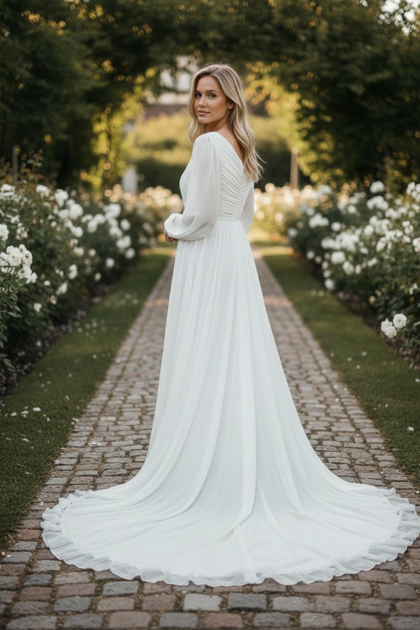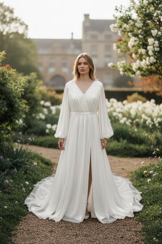 A simple & minimalist says it all for this dress. A soft & flowy gathered chiffon skirt with a front split flowing in to a chapel train. The bodice features ruching & V neckline with long puffy sleeves. Zip back closure.